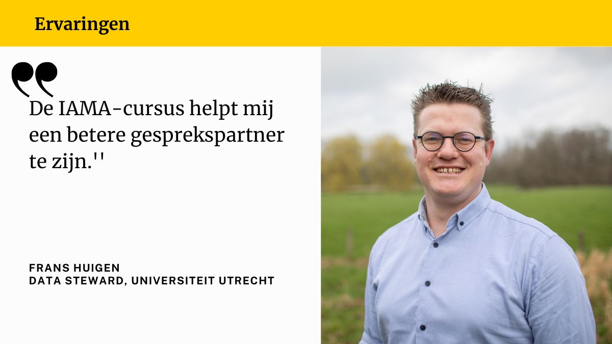 Daar ben ik ruimschoots in bediend, omdat het IAMA meer vraagt dan alleen ‘wat doe je en waarom?’. Het geeft me begrip van bepaalde terminologie in het werkveld en biedt een breder perspectief. De IAMA-cursus helpt mij een betere gesprekspartner te zijn – de onderzoeker bijvoorbeeld blijft de expert, ik help bij de navigatie langs wet- en regelgeving en ethische kwesties.’