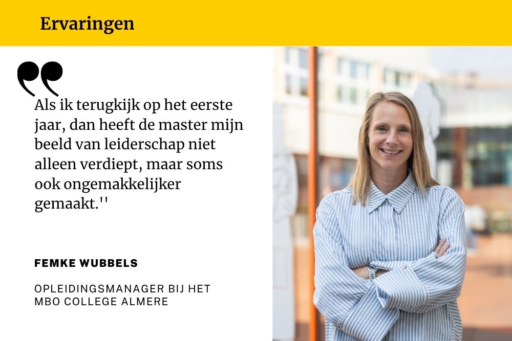 ‘’Ik ben met deze master begonnen vanuit nieuwsgierigheid naar wat ik nog meer uit mezelf en mijn leiderschap zou kunnen halen. Juist het publieke karakter sprak me aan. In het onderwijs werk je nooit los van de samenleving, en ik wilde dat niet alleen vanuit gevoel of ervaring benaderen, maar ook meer taal, kennis en diepgang ontwikkelen.